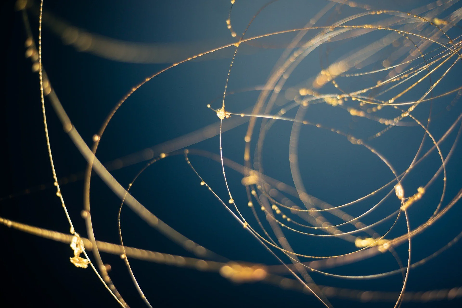Patterson’s Celestial Orbs series immerse us in an imagined cosmic space. The series was inspired by Patterson’s synesthetic response, seeing shapes while listening to composer Patrick Harlin’s Earthrise. Utilizing piano wire, gold leaf and resin, each work resembles a three-dimensional drawing spinning in space and simultaneously evoke constellations and rhythmic musical movements. All are named after musical terms, including Accelerando (a gradual increase in tempo), Harmonics (a sound wave that has a frequency that is an integer multiple of a fundamental tone), and Tremolo (a wavering effect in a musical tone).